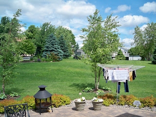 Viola - my new clothes line. It folds for easy storage (read: it's not sitting out there all the time driving my husband crazy), and I dug the hole for the quick-crete in the landscaping rocks (read: there isn't a concrete circle in our green yard). Also, it's better for the clothes and the enviroment. Go me.